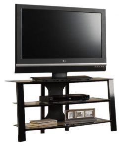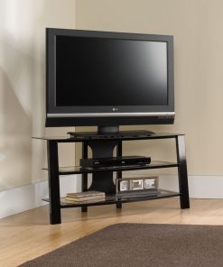 Add a touch of elegance and sophistication to your living room space with this Contemporary 40-inch Black Metal TV Stand with Clear Glass Shelves. This multipurpose console furniture sports unique structure and beautiful blend of modern and traditional design that compliments any home decor and provides multiple utility options. The TV stand comes in a graceful black clear glass finish to charm your personalized home decor with grace and sophistication. This multipurpose stand is not just pleasing to look at but also provides ample storage space to organize your home entertainment set at one place. The TV stand is constructed with steel making it robust and sturdy for accommodating standard 40″ television sets weighing 70 lbs. The stand features open shelving to provide ample space for storing your media device and gaming consoles near to your television set for easy synchronization and access. Specifically designed for corner or wall placement, this multipurpose TV stand features TV mounting, versatile storage, and expansive work space for maximum utility. The black edged glasses complement the overall metal frame and provide it an ultra-modern style fit for any home decor. The eco-friendly and non-toxic TV stand comes with cord management that enables you to access the wires and conceal them for a clutter-free and neat appearance. The TV stand requires assembly and can be maintained conveniently without any hassles.