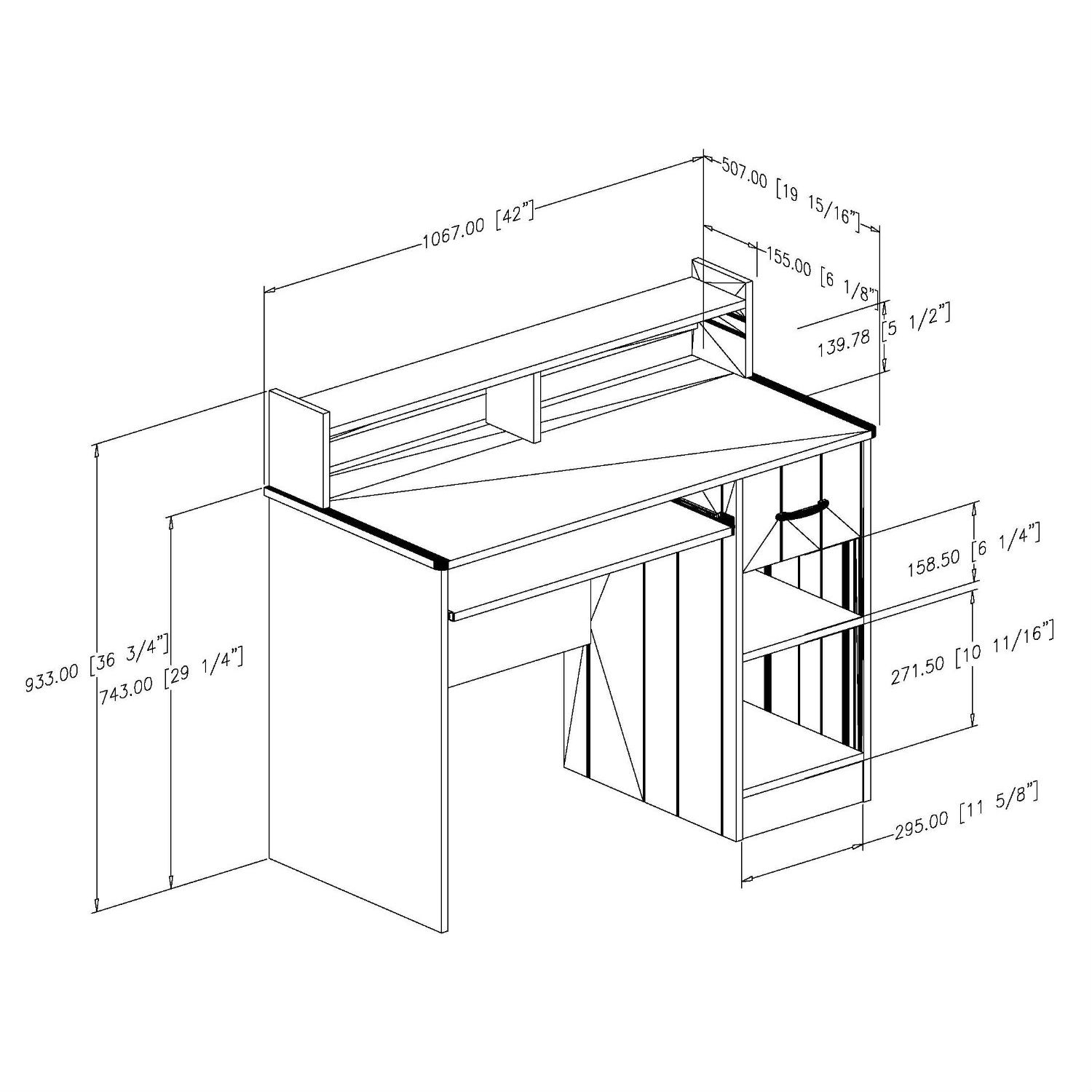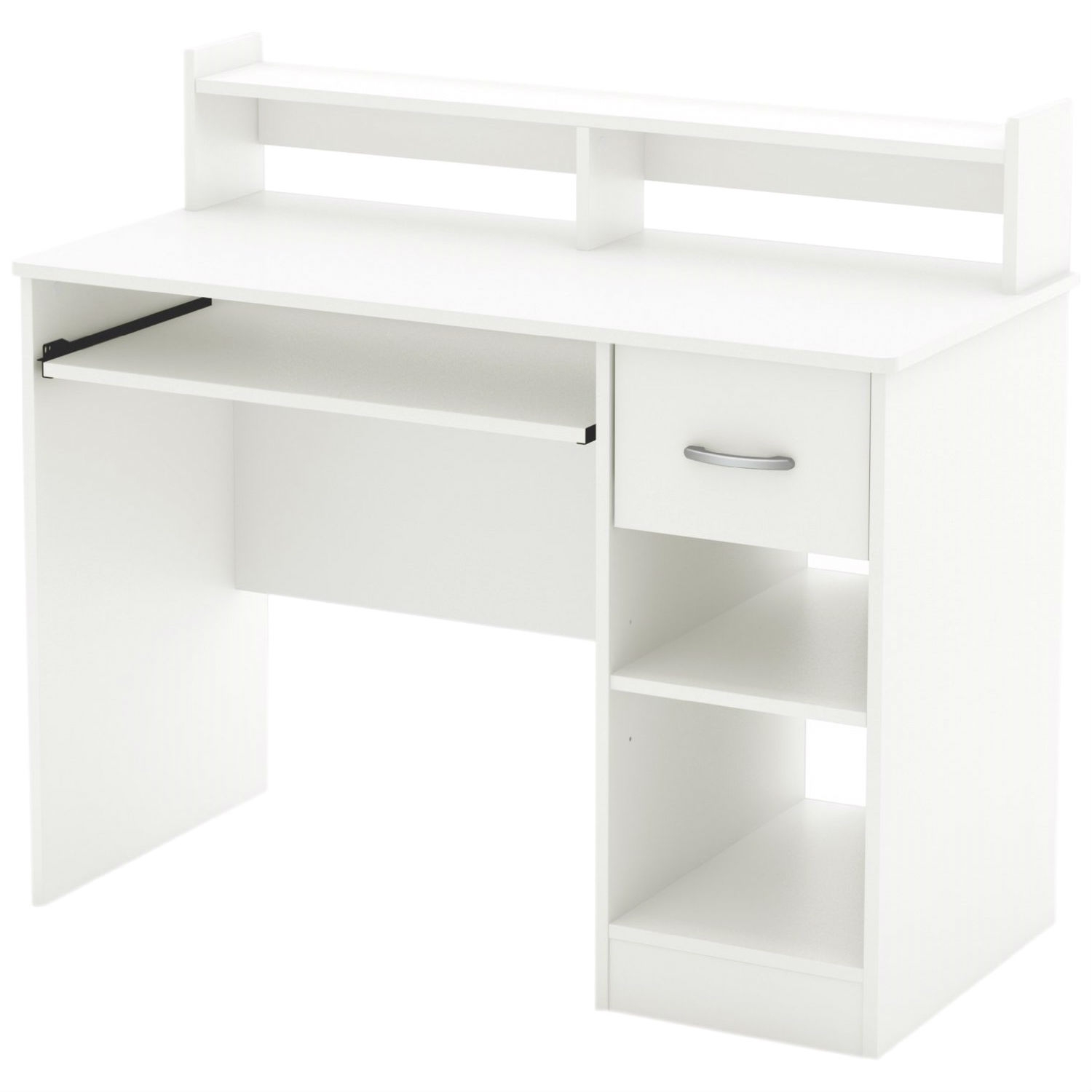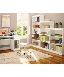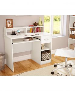This Contemporary Home Office Computer Desk in White Wood Finish is the perfect answer to organizing clutter in your child’s room. It features a compact design yet includes space for everything needed for schoolwork and projects. A low hutch offers shelving for books or keepsakes, and the desktop, plenty of room to spread out homework or a house laptop. Under it, you will find a keyboard tray, one practical drawer with a silver finish metal handles and a storage compartment divided by an adjustable shelf. for complete interior dimensions see spec sheet. Also available in Pure Back or Chocolate finish. The back is not laminated and the accessories are not included. It measures 42-inch wide by 20-inch deep by 36-3/4-inch high. It is delivered in a box measuring 46-1/4-inch by 24-1/4-inch by 8-3/4-inch and weighing 80 pounds. Manufactured from certified Environmentally Preferred laminated particle panels. Complete assembly required by 2 adults. Tools are not included. 5-year limited warranty. Made in Mexico.