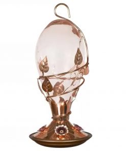 This stunning feeder, with its beautiful vine-like design will bring tiny hummingbirds from all around to eat. This Copper and Glass Hummingbird Feeder – 32 Fl. oz. Nectar Capacity features a durable, tempered tinted glass nectar container and 4 copper flower feeding ports. The nectar container holds 32 fl oz of nectar – plenty for all of the hummingbirds who will flock to it! Its tinted glass reservoir makes it easy to monitor the nectar levels and unscrews easily from the feeder base for quick cleaning and filling. These innovations make for one of the most economical and convenient glass hummingbird feeders on the market! Remember to clean your bird feeders at least twice a week, more often in very warm climates or seasons.