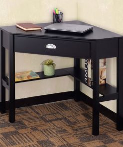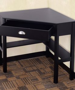 This Corner Black Wood Computer Desk with Drawer is an ideal addition to almost any home or office, providing an ample surface to meet the demand of your work or study while the space is limited. The workstation represents an efficient use of space, while emphasizing the essence of comfort and style. The space-saving corner design make it fit to any room. Featuring a large slide-out drawer, it will allow you to keep your supplies organized. Bottom shelves is where you can have your favorites within easy reach. This student corner desk perfectly suits to the corners, with a contemporary look that blends easily with almost any decor.