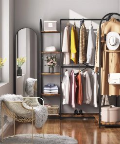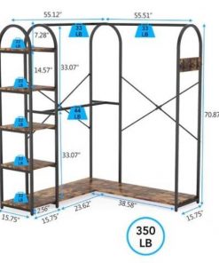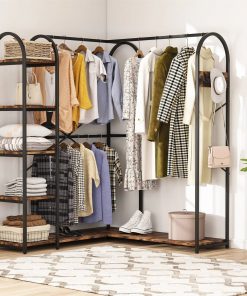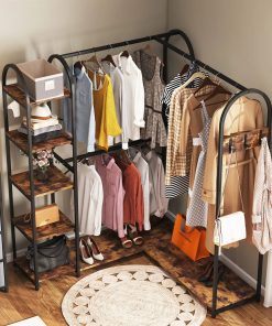 This Corner L-Shaped Garment Rack with Clothing Hanging Rods and Storage Shelves features a warm tone, industrial style, and classic design, complete and accent any style of your home decor. A combination of shoe rack, shelf, and clothes rail, it provides all the storage space you need. Use this corner closet system to bring organizational appeal to your wardrobe rather than sorting through an overstuffed closet. Adopts a smart L shape corner design, this closet rack saves space while also improving its functionality. You get double storage capacity without taking up extra space in your bedroom. Its perfectly sized to slide into a corner, to save space in your room. The corner design splits into double clothing storage spaces, creating extra storage space instantly in your room. Available with 6 sturdy shelves to utilize, and 3 ultra-durable garment rods one in a full-length frame to hang anything from long dresses and pants to shirts and much more.