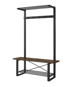Dark Brown Walnut Rustic Sturdy Metal Entryway Hall Tree Coat Rack