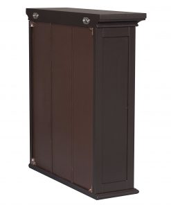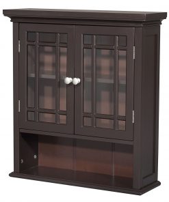 This Dark Espresso 2-Door Bathroom Wall Cabinet with Open Shelf offers sleek lines for a modern look. This cabinet features two glass doors accented with grid-work design and beveled molding. This unit offers plenty of storage space with one open shelf and one interior adjustable shelf making it easy to store items of different heights. Satin Nickel door knobs showcase the modern design. This cabinet comes with assembly hardware.