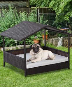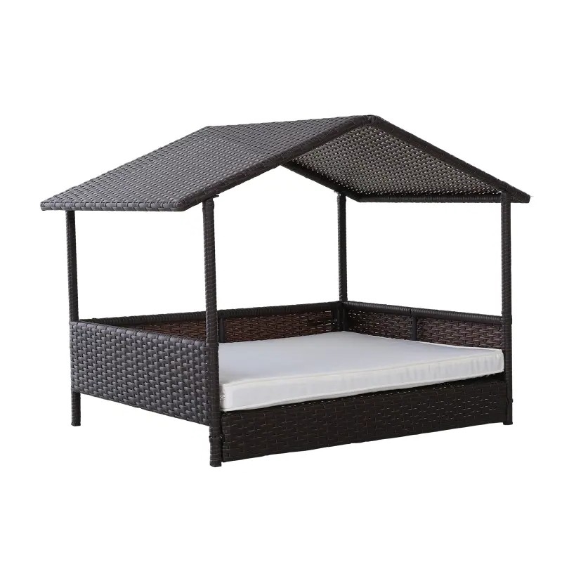 Give your favorite small/medium dog or cat a place that they can call home both indoors and out with the Espresso Wicker Weather Resistant Raised Dog Bed House with 2 in Thick Cushion. This Espresso Wicker Weather Resistant Raised Dog Bed House with 2 in Thick Cushion is suited for small to medium sized animals to use as a home or favorite resting space. Comes with plenty of space to bring toys, blankets, treats. Contemporary style pet cabana design protects from weather and is made with steel and PE rattan. 2 inch thick soft padded cushion provides extra comfort to pets. Protective anti-slip pads keep all four legs sturdy. Elevated legs keeps pets from getting too hot or cold.