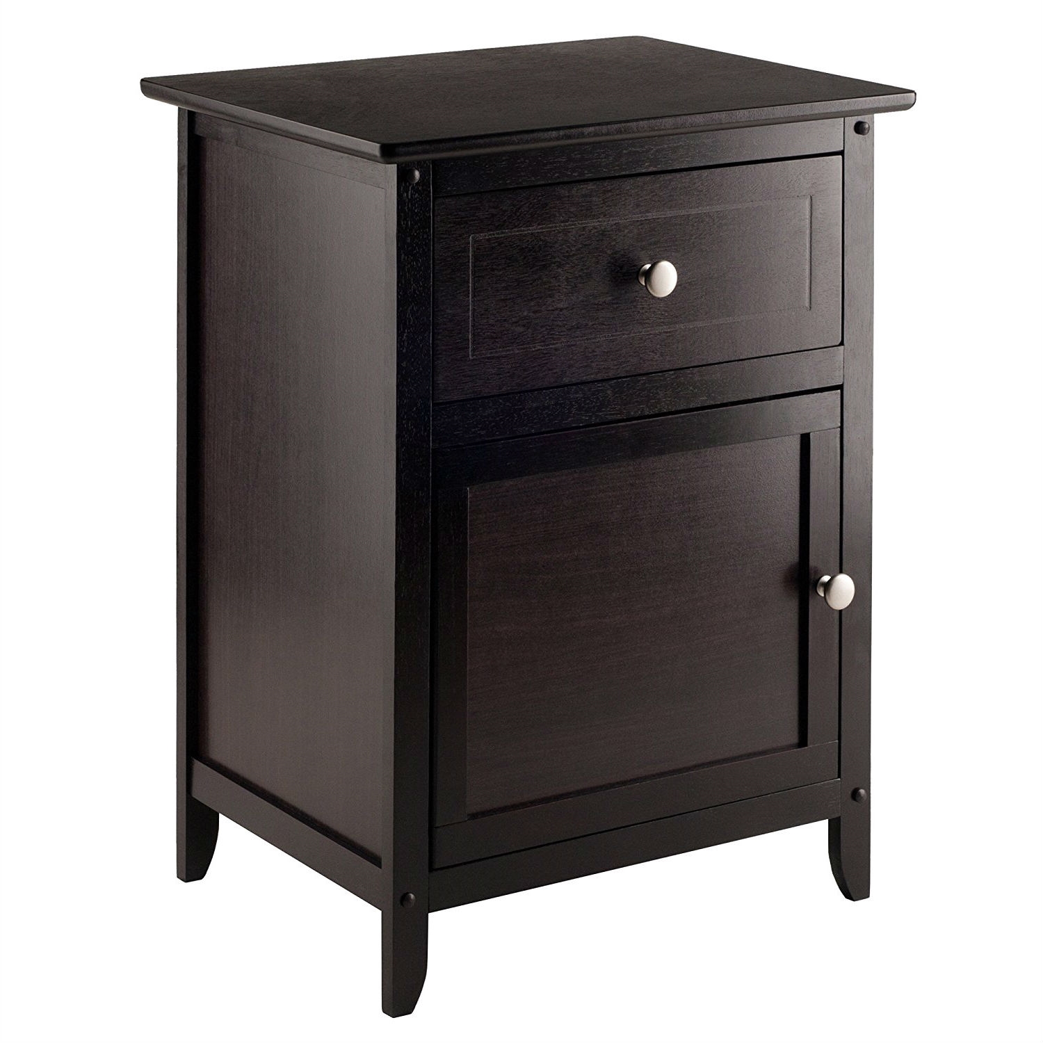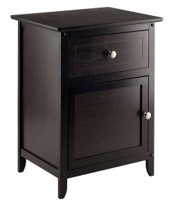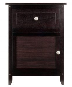 Tuck remote controls and drink coasters inside the drawer of this Espresso Wood End Table Nightstand Accent Table. With its clean lines, slightly tapered legs, and uncomplicated design, the table fits easily into traditional and more modern interiors alike. Set the table next to a sofa in the living room, or use as a night stand with a lamp placed on top. The table is crafted out of wood/composite with a warm espresso finish. For storage, the table offers a small drawer and a single-shelf cabinet. Both the drawer and the cabinet door provide a round satin nickel knob for opening and closing; the cabinet’s hinges are pre-installed on the right side of the door to swing open from left to right only. Upon delivery, the table requires home assembly and comes with necessary hardware and tools. The assembled table measures 19 inches wide by 15 inches deep by 25 inches high. This item weighs 21 pounds upon shipping.