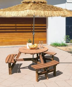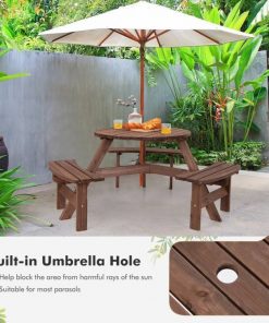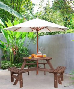 This Espresso Wooden 6 Seater Picnic Table Umbrella Hole can comfortably seat up to 6 adults. Whether you’re hosting a barbecue or enjoying an outdoor meal, the picnic table provides the perfect gathering place for your family and friends. It is made of fir wood, sturdy and durable. And it also be treated with water-based paint, which adds an extra layer of protection and provides a beautiful, lustrous finish. 2 inch umbrella hole featured in the middle of the table.