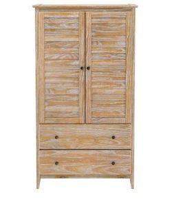 This FarmHome Louvered Distressed Driftwood Solid Pine Armoire has what it takes to give your bedroom that refined FarmHome coastal touch. It’s modernized traditional style results in a timeless design, while adding lots of storage with 2 large Louvered doors and two spacious 8 1/4 deep drawers. Made of 100% solid pine wood, this customizable wardrobe features a sturdy construction that can lasts.