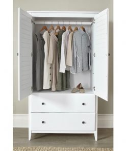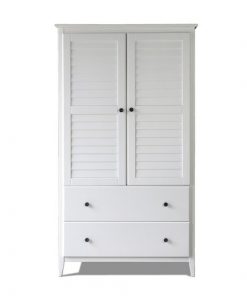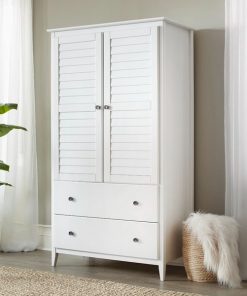 This FarmHome Louvered Distressed White Solid Pine Armoire has what it takes to give your bedroom that refined FarmHome coastal touch. It’s modernized traditional style results in a timeless design, while adding lots of storage with 2 large Louvered doors and two spacious 8 1/4 deep drawers. Made of 100% solid pine wood, this customizable wardrobe features a sturdy construction that can lasts.