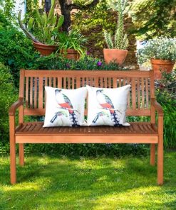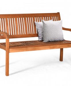 Seats taken!! Come rest your bones on the FarmHome Slatted 2 Seater Garden Eucalyptus Bench! The FarmHome Slatted 2 Seater Garden Eucalyptus Bench is made of natural and premium eucalyptus offering a sturdy and durable daily garden bench for your indoor/outdoor sitting areas. Slightly sloping backrest and curved armrest for comfortable resting. Pillows in picture are NOT included.