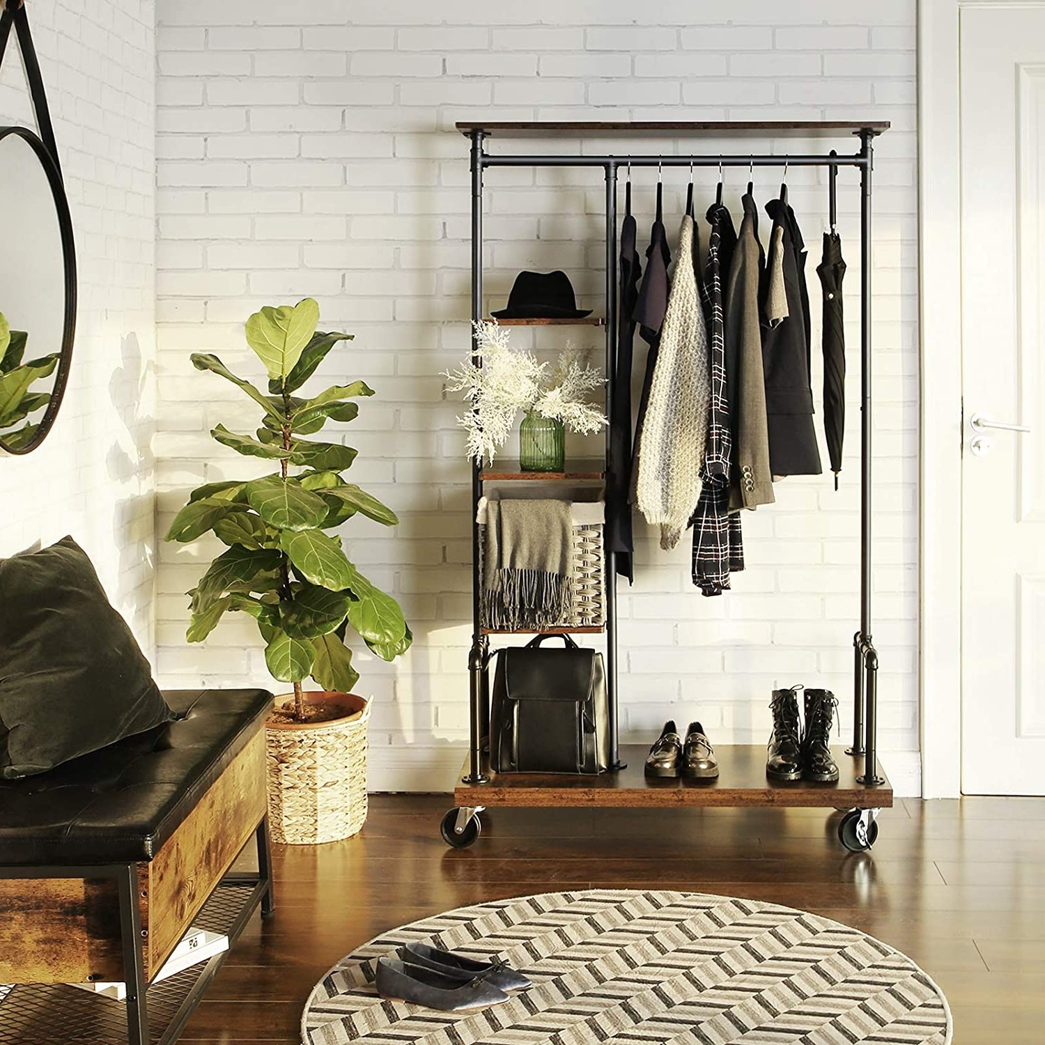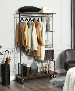 Bring your closet with you anywhere with the Farmhouse 5 Tier Laundry Pipe Garment Closet Rack Wheels. While you can put this industrial-style clothing rack in your closet, this is one youll definitely want to have on display in your bedroom, living room, or show room floor. With rustic engineered wood shelves sitting among an iron pipe frame, it brings urban style to whatever room you put it in, complementing your good taste in fashion. With welded iron pipes, this clothing rack on wheels supports even your heaviest of sweaters and winter coats. Hang up your clothes, store out-of-season wear in boxes up top, put some purses on the side shelves, and place shoes on the bottom.