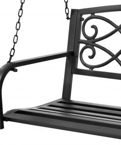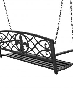 Swing in style with the Farm Home Black Sturdy 2 Seat Porch Swing Bench Scroll Accents. Crafted with a sleek, rustic design sure to blend well with your home’s porch or patio decor. This classic, eye-catching swing bench boasts a fleur-de-lis design in the center of its back for a touch of refined beauty.Lounge outside for some you time or hang out with a friend, as the bench can easily seat 2 people. Made of heavy-duty metal, this bench withstands the elements to resist rust buildup and last through the years.