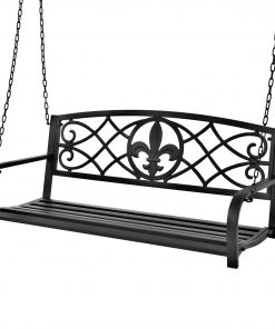 Swing in style with the Farm Home Black Sturdy 2 Seat Porch Swing Bench Scroll Accents. Crafted with a sleek, rustic design sure to blend well with your home’s porch or patio decor. This classic, eye-catching swing bench boasts a fleur-de-lis design in the center of its back for a touch of refined beauty.Lounge outside for some you time or hang out with a friend, as the bench can easily seat 2 people. Made of heavy-duty metal, this bench withstands the elements to resist rust buildup and last through the years.