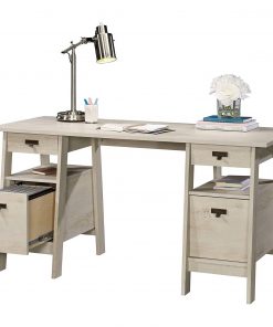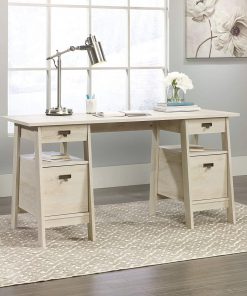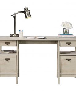 This FarmHouse Chalky Oak Executive Desk w/ Filing Cabinets Storage offers a spacious top surface that provides you with all the room you need for your must have desk essentials like your laptop, a cup full of pens, stacks of notepads and your favorite coffee mug. You can even find space for home décor items like an accent lamp and picture frames too. This computer desk features 2 small drawers that open and close on smooth metal runners for easy access storage of supplies. It also includes 2 file drawers with full extension slides to hold letter-size hanging files. Other features include a grommet hole for cord access so you can keep all your wires neat and out of the way.
