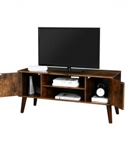 Classic and charming, this Farmhouse Entertainment Center Brown TV Cabinet looks great in any living room. This entertainment center features 2 shelving areas and push-to-open doors a large tabletop for your TV cable boxes and movies with the simple push-to-open cabinet door you can say goodbye to unnecessary door handles and grab your belongings with ease! The canted legs of this TV console are solid rubberwood supported by screws and wooden pegs for extra stability with the durable particleboard frame this entertainment center holds up to 110 lb