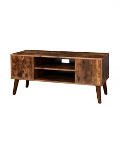 Classic and charming, this Farmhouse Entertainment Center Brown TV Cabinet looks great in any living room. This entertainment center features 2 shelving areas and push-to-open doors a large tabletop for your TV cable boxes and movies with the simple push-to-open cabinet door you can say goodbye to unnecessary door handles and grab your belongings with ease! The canted legs of this TV console are solid rubberwood supported by screws and wooden pegs for extra stability with the durable particleboard frame this entertainment center holds up to 110 lb