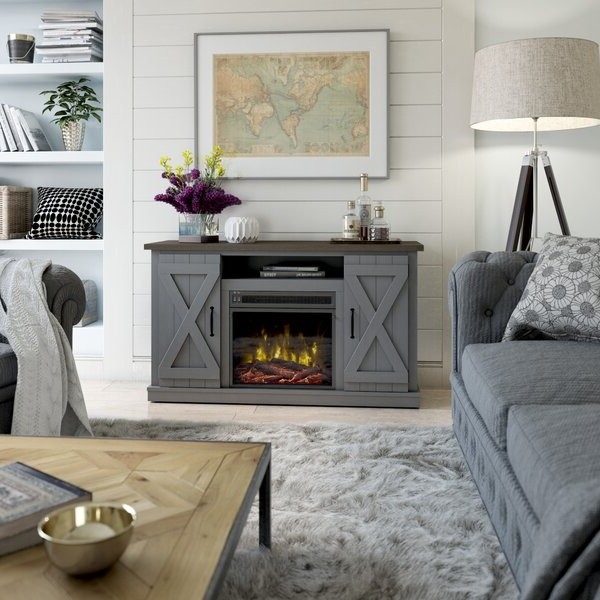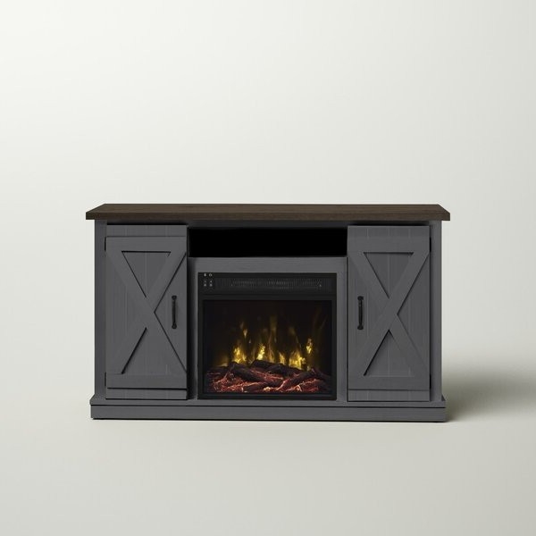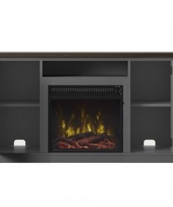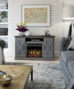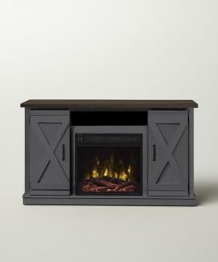 This FarmHouse Rustic Grey/Espresso TV Entertainment Electric Fireplace has a charming, rustic aesthetic and creates a cozy environment in any living room. Each of the 2 cabinets opens to store media players, games, books, and other equipment, while the 3 open shelves give you a place to display your favorite decorative objects. We love how the weathered look of the wood and barn doors add a farmhouse feel to your living room. Plus, a cable management cutout organizes your cords. Fits TVs up to 60”.