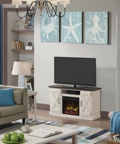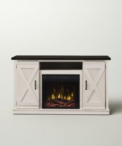 This FarmHouse Rustic Ivory/Espresso TV Entertainment Electric Fireplace has a charming, rustic aesthetic and creates a cozy environment in any living room. Each of the 2 cabinets opens to store media players, games, books, and other equipment, while the 3 open shelves give you a place to display your favorite decorative objects. We love how the weathered look of the wood and barn doors add a farmhouse feel to your living room. Plus, a cable management cutout organizes your cords. Fits TVs up to 60”.