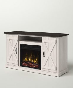 This FarmHouse Rustic Ivory/Espresso TV Entertainment Electric Fireplace has a charming, rustic aesthetic and creates a cozy environment in any living room. Each of the 2 cabinets opens to store media players, games, books, and other equipment, while the 3 open shelves give you a place to display your favorite decorative objects. We love how the weathered look of the wood and barn doors add a farmhouse feel to your living room. Plus, a cable management cutout organizes your cords. Fits TVs up to 60”.