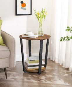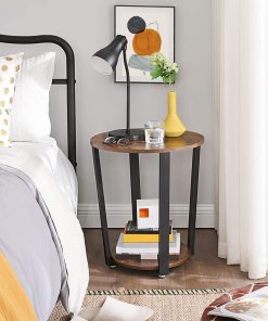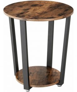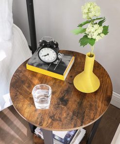 Give your home a farm home rustic touch with this Farmhouse Rustic Round Sofa Side Table Nightstand Storage Rack. Heavy Duty Matte Black iron frame. Square tables are ok with most, but this rustic round side table brings a breath of fresh air into your home. The retro vintage style exudes a touch of classic flair. This side table will accentuate an antique decoration in your home or a banquet of beautiful flowers with its black iron bars and dark wooden table top, a highlight for your living room, bedroom, office, or other spaces. Delivered to you in only 4 individual parts, so the setup is simple and fast.