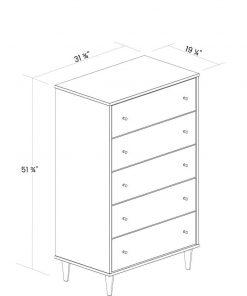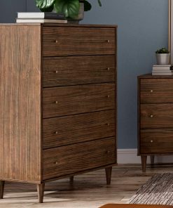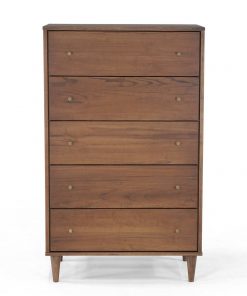 Simple, clean lines for an airy aesthetic and honestly high-quality materials for durability and practicality. This Farmhouse Rustic Walnut Mid Century 5 Drawer Chest is designed in-house to highlight these principles of mid-century modern design. The iconic cone shaped legs are built of sturdy eucalyptus wood. The simple details of this piece won’t stand out at first, but will complement many modern or contemporary design styles; and a closer look will reveal an honestly high-quality finish.