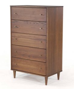 Simple, clean lines for an airy aesthetic and honestly high-quality materials for durability and practicality. This Farmhouse Rustic Walnut Mid Century 5 Drawer Chest is designed in-house to highlight these principles of mid-century modern design. The iconic cone shaped legs are built of sturdy eucalyptus wood. The simple details of this piece won’t stand out at first, but will complement many modern or contemporary design styles; and a closer look will reveal an honestly high-quality finish.