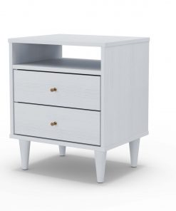 The Farmhouse Rustic White Mid Century 2 Drawer Nightstand showcases the unique levity and simplicity of the mid-century modern style and combines it with durable, high-quality materials. Designed in-house, its details emphasize the functionality and simplicity characteristics of the mid-century modern movement. The mid-century modern dedication to the honest use of materials is reflected in the use of renewable, durable solid wood. The iconic cone shaped legs are built of sturdy eucalyptus wood. Combined with a practical open shelf, the nightstand feels as if it almost floats in the space. This piece’s combination of material quality, high-quality design, and environmental consciousness makes it an addition to your home you can feel confident about.