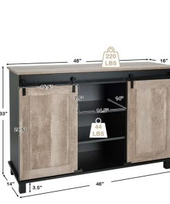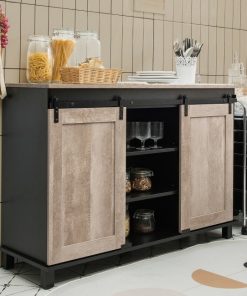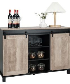 This FarmHouse Sliding Barn Doors Kitchen Buffet Storage Cabinet has a spacious desktop, 2 adjustable open shelves, and more storage compartments behind those natural sliding barn doors. Works as a sideboard, storage cabinet, buffet, and in any room with its added farmhouse style. The bar cabinet is mainly crafted with MDF and natural wood for long-lasting qualities. It is worth pointing out that the wine cabinet is supported by 5 legs and double-secured with the anti-toppling device at the back for enhanced stability and safety. Surface is anti-scratch and water-resistance.