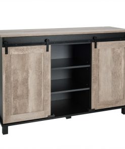 This FarmHouse Sliding Barn Doors Kitchen Buffet Storage Cabinet has a spacious desktop, 2 adjustable open shelves, and more storage compartments behind those natural sliding barn doors. Works as a sideboard, storage cabinet, buffet, and in any room with its added farmhouse style. The bar cabinet is mainly crafted with MDF and natural wood for long-lasting qualities. It is worth pointing out that the wine cabinet is supported by 5 legs and double-secured with the anti-toppling device at the back for enhanced stability and safety. Surface is anti-scratch and water-resistance.