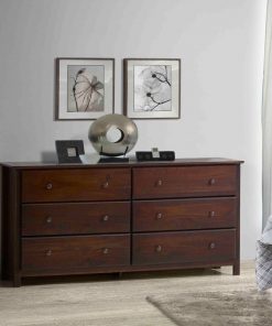 Attractive metal knobs, a rich finish, and elegant style: this luxurious looking Farmhouse Cherry Solid Pine Wood 6 Drawer Dresser has what it takes to give your bedroom that refined touch. Featuring lots of storage with six spacious 6 1/2 deep drawers. Made of 100% solid pine wood, this dresser is built with a sturdy construction that lasts for years.