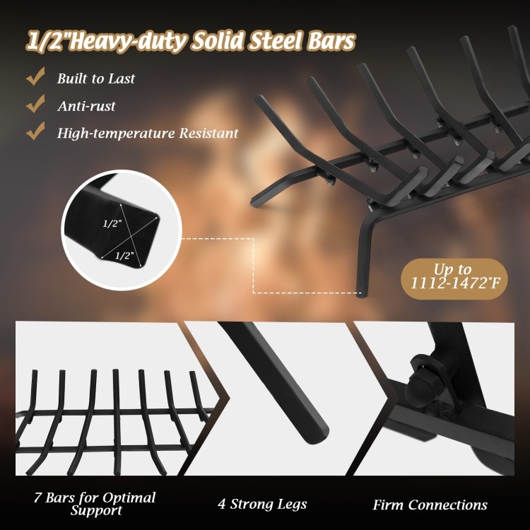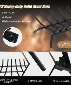 Every fire pit/place needs a main squeeze! This heavy-duty iron fireplace grate is a great functional tool to burn firewood of all shapes and sizes. Constructed of high-grade wrought iron with heat-proof coating, the fire grate not only possesses high stability but also resists well to ultra-high temperatures. 7 supporting bars with 1/2″ thickness ensures strong load capacity. V-shaped design makes it easier to burn the logs. Raised base ensures good air circulation so firewood can burn for a longer time. This compact fire grate will be a perfect addition to the chimney hearth, fireplace, outdoor fire pit and so on.