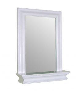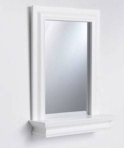 This Framed Bathroom Mirror Rectangular Shape with Bottom Shelf in White Wood Finish would be a great addition to your home. It has a beautiful crown molding and detailed frame edging.