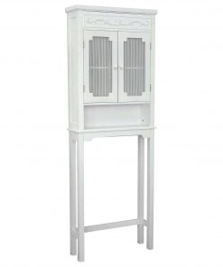Do you have a small, cluttered bathroom? Get the clutter off your bathroom counter by putting a Frosted White Elegant Glass Doors Bathroom Space Saver behind your toilet. There’s no need to install this piece on the wall – just set it up and start maximizing every inch of your small bathroom. Two glass-paned doors with frosted white curtain details conceal an adjustable shelf for organizing your assorted toiletries. Made of medium-density fiberboard laminate with a charming antique white finish, this cabinet features delicate wood carving on the top rail as the crowning touch. Some assembly required.