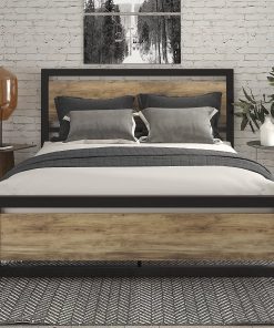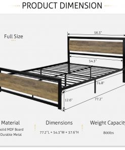 - Full Metal Platform Bed Frame with Brown Wood Panel Headboard and Footboard