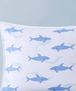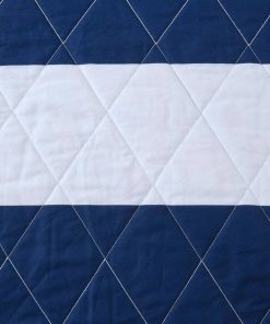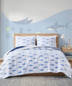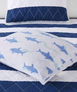 This Full/Queen 3 Piece Coastal Reversible Navy/White Sharks Cotton Quilt Set adds a bright, playful accent to any bedroom with its colorful two-tone navy/white stripe pattern on one side and a bold print on the reverse. It includes a quilt with a noticeable diamond weave along with two coordinating shams.. Each item is made from a breathable cotton fabric that arrives pre-shrunk and is good for all seasons. This set is non-pilling, so it stands up to frequent use and multiple trips through the washing machine.
