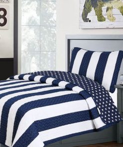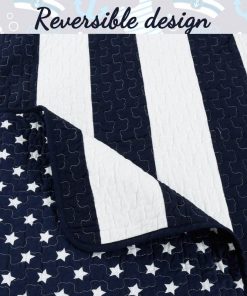 This Full/Queen Size, 3 Piece Navy Blue and White Stars/Stripes Cotton Reversible Quilt Set with printed texture background brings the sailor style no matter where you live. Perfect for your own restful retreat, and sure to impress weekend visitors when outfitting the guest room, this set features a pop of pattern thanks to its two-tone striped pattern. This quilted throw can be machine-washed and tumble-dried to refresh its look and wash any dirt and grime. It is preshrunk and will retain its shape even after a wash.