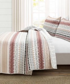 Bring warm and rustic southwest style to your bedroom with this Full/Queen Lightweight Rustic Reds Stripe Reversible 3 Piece Quilt Set. Each piece is printed with Aztec inspired geometric stripes. The reverse of this 3-piece set features a pinstriped arrow design. This set includes a soft lightweight reversible quilt and two matching reversible pillow shams. Perfect for those hot summer days!