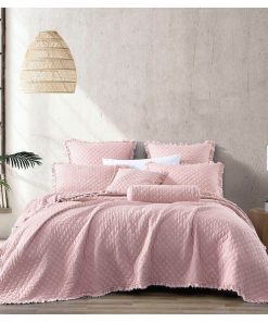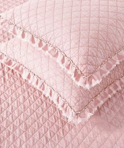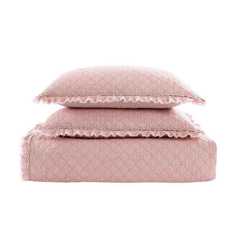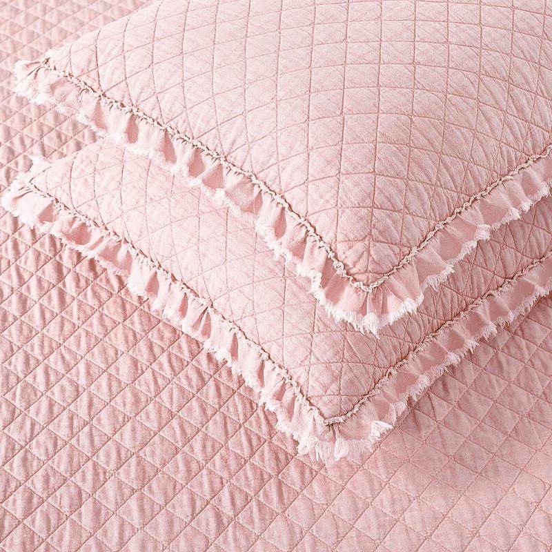 - Frayed edge ruffle fringe on quilt and shams for a relaxed boho look