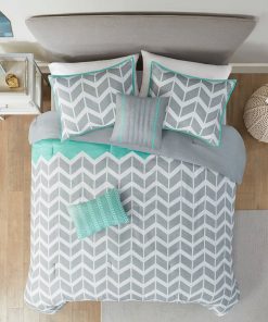 - Full/Queen Reversible Comforter Set with Grey White Aqua Teal Chevron Pattern