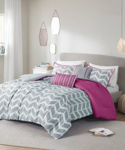 - Full/Queen Reversible Comforter Set with Grey White Purple Pink Chevron Pattern