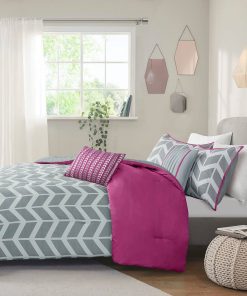 This Full/Queen Reversible Comforter Set with Grey White Purple Pink Chevron Pattern updates any bedroom into a fun and inviting space. This stylish comforter features a grey and white chevron print broken up by white vertical stripes and a solid purple at the top that pops! The 2 matching shams (1 in Full/Queen) with a purple flange pairs perfectly with the delightful chevron pattern, while 2 decorative pillows in coordinating colors help complete the look. Made from ultra-soft microfiber, this comforter set is machine washable for easy care. This bedding set uses an antimicrobial treatment that provides built-in freshness protection, reducing the growth of odor causing bacteria to keep fabric lasting longer.
