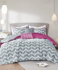- Full/Queen Reversible Comforter Set with Grey White Purple Pink Chevron Pattern