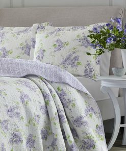 Wisteria blossoms cascade across a pristine white background in this Full / Queen size 3-Piece Cotton Quilt Set with White Purple Floral Pattern that will bring a touch of springtime to your bedroom. Pale Lilac tones mix with grass green for a fresh, clean color palette, accented by the white vine stripe print on an Amethyst ground for the quilt reverse. The all cotton quilt is pre-washed for extra softness and the allover vermicelli quilt stitching adds dimension and extra comfort.