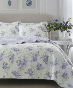 - Full / Queen size 3-Piece Cotton Quilt Set with White Purple Floral Pattern