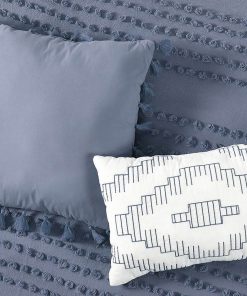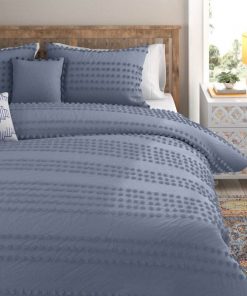 This 5-piece Full/Queen 100% Cotton Boho Dot Comforter Set Denim tops your bed with laid back style. Complete set includes 1 comforter, 2 matching pillow shams, 2 square throw pillows. 100% pre-washed cotton that only gets softer over time and a clip dot design that lends visual and tactile appeal. This product is Oeko-tex certified to contain no harmful substances or chemicals, ensuring quality comfort and wellness. Crafted with premium pure cotton for breathability and superb moisture absorption ability to ensure a cool, comfortable, and refreshing sleep. The three-season comforter has a polyfill filling that plumps up easily, which means quick bed-making. This set requires hand washing. If you love a layered look, add a couple more accent pillows in complementary colors or bold patterns.