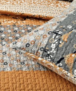 This stylish Full/Queen Size Orange Grey Floral Birds Reversible 3 Piece Quilt Set is loaded with color and works both in a contemporary or traditional room. It has printed pieced fabrics on one side and a full print on the reverse. The perfect weight for year round use, this 3 Piece Quilt Set has continually ranked among top sellers. The bright colors and unique patterns on 100% cotton are popular with all ages, and the look is perfect for a master bedroom or guest bedroom. Our 3 Piece Quilt Set includes a soft cotton quilt and two matching pillow shams which complete the look.