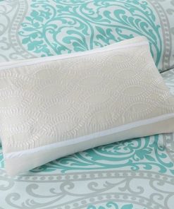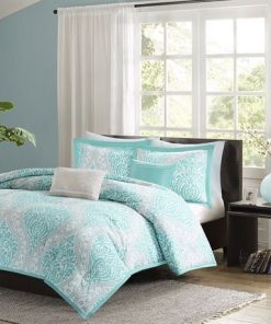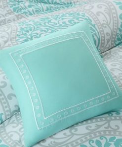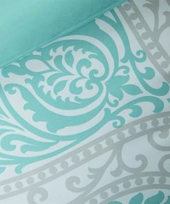 This Full / Queen Teal Turquoise Aqua Blue and White Damask Comforter Set is the perfect way to make a fashion statement in your bedroom. The vibrant aqua and grey damask print adds a pop of color to this comforter. Two embroidered decorative pillows are included in this comforter set for a finished look. Comforter/Sham: 100% polyester peach skin, printed, 100% brushed polyester reverse, 200g polyester filling Pillow: polyester cover and polyester filling.