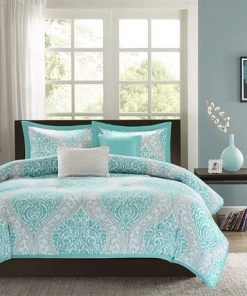 This Full / Queen Teal Turquoise Aqua Blue and White Damask Comforter Set is the perfect way to make a fashion statement in your bedroom. The vibrant aqua and grey damask print adds a pop of color to this comforter. Two embroidered decorative pillows are included in this comforter set for a finished look. Comforter/Sham: 100% polyester peach skin, printed, 100% brushed polyester reverse, 200g polyester filling Pillow: polyester cover and polyester filling.