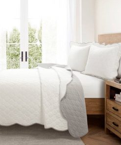 Full/Queen White Grey Scalloped Edge Reversible Thin Light Quilt Set