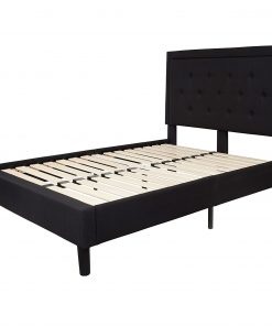 Retreat in style with this Full size Black Fabric Upholstered Platform Bed Frame with Headboard. Platform beds are designed to give your room an open concept feel and are perfect for those who don’t like high seated beds. One advantage is the soft panel headboard as well as the cushion like base. The headboard features gorgeous nail trimming and button tufted upholstery. The frame features 15 wood slats that are designed to support your mattress without the use of a box spring. Finally, a bedroom designed to give you a comforting and peaceful nights rest.