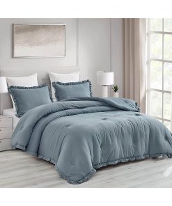 Transform your bedroom in a sophisticated and luxurious manner with this Full Size Blue Stone Washed Ruffled Edge Microfiber Comforter Set. An attractive ruffled edge trim with an elegant yet simple presentation that makes you feel right at home. Fashionably providing everyday comfort. Lightweight, high loft comforter with adequate warmth for year-round use. The comforter is made of 100% microfiber polyester, giving a super soft smooth, and cozy feel. The fabric is stone-washed which creates a natural attractive crinkled fabric effect to enhance the aesthetics of the comforter.